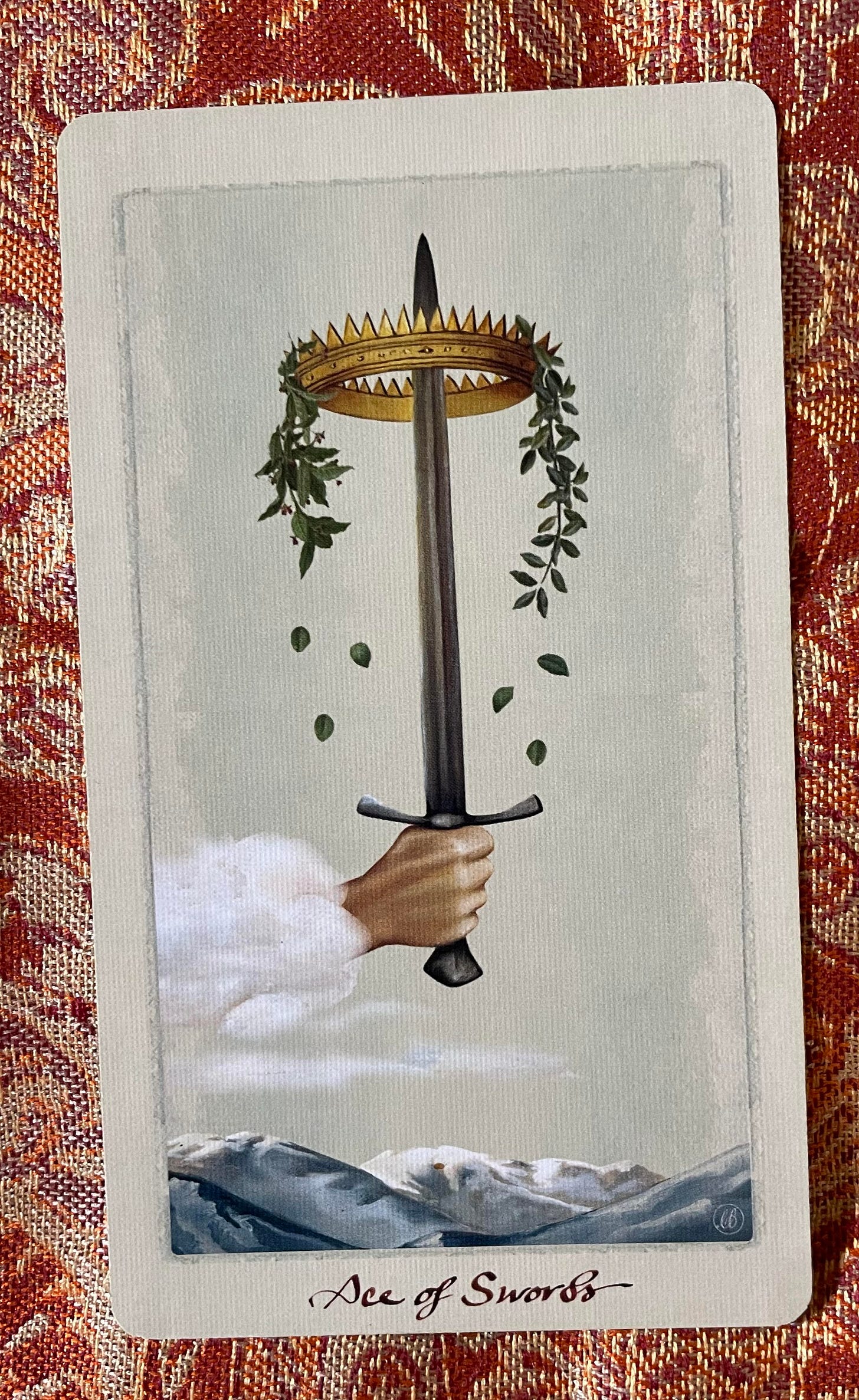 Whatever chance your Ace of Sword might represent for you, the underlying message is for you to “be on the watch” as Charles Bukowski says. Try to access whatever way you can to cut through mental fog and clutter. Question the stories that you habitually tell yourself, especially if they leave you feeling helpless or give agency to another person or to a corporation or government. And add an equal measure of compassion for yourself and others; no mental breakthrough is worthwhile if it seeks to punish or demonize individuals or groups.